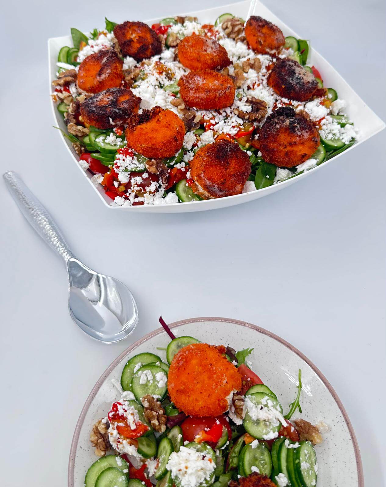 סלט המורכב מעגבניות שרי, מלפפונים, חסה לליק, פלפל קלוי, עלי בייבי, פטה מגורדת, טבעות עיזים מטוגנות ואגוזי מלך